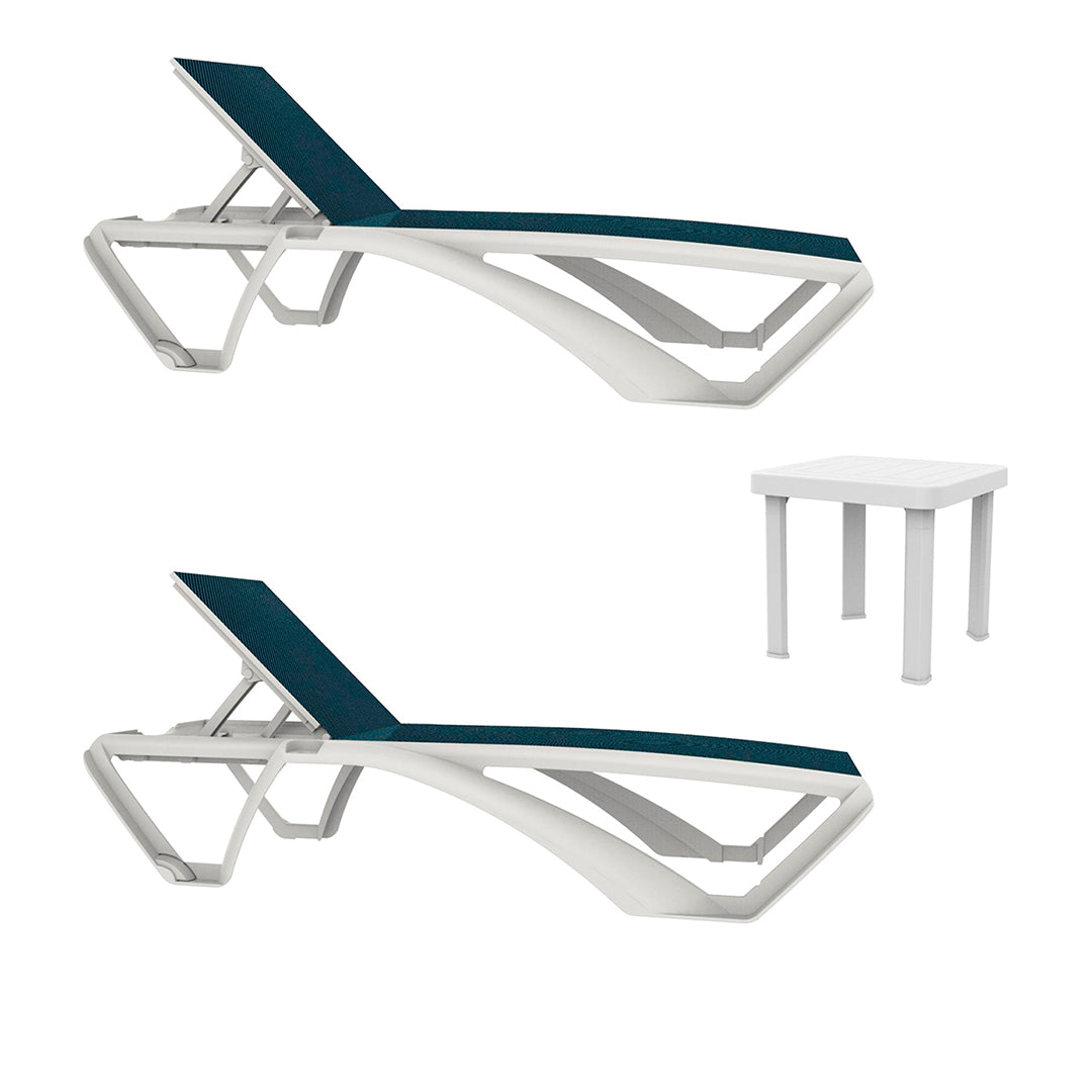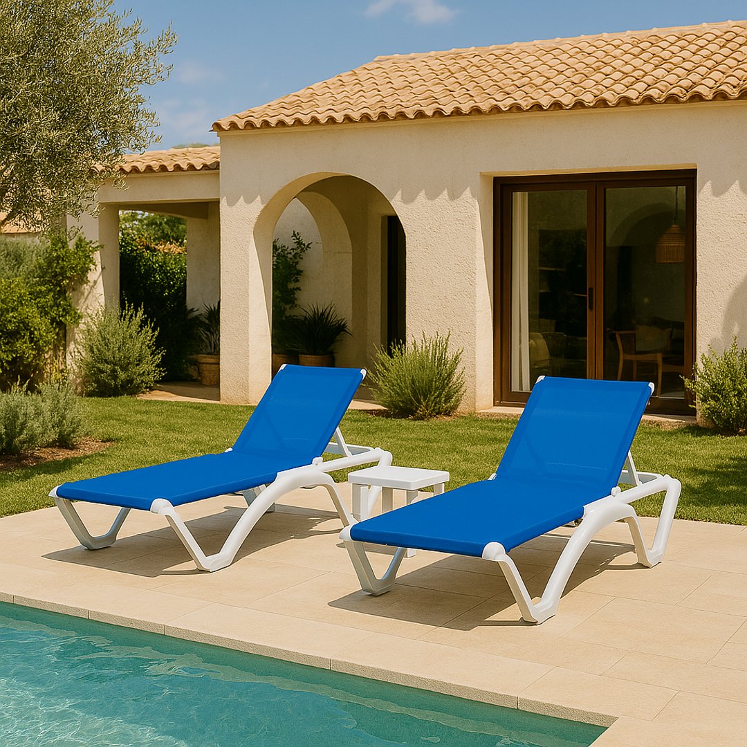 The Marina set , which includes two white and blue sun loungers with a side table, is ideal for relaxing by the pool or on the patio. This set has been designed to offer maximum comfort and durability in outdoor environments such as patios, terraces, and pool areas. The sun loungers are made of reinforced polypropylene and feature heat-sealed textilene fabric for added strength.