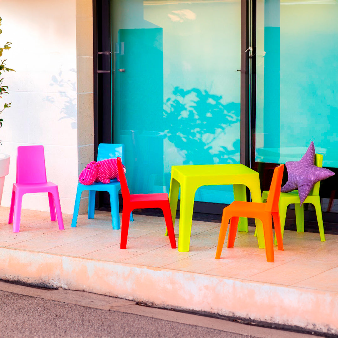 The Julieta children's play set , consisting of an orange table and four chairs, is perfect for classrooms, nurseries, and school playgrounds . This set offers children a safe, comfortable, and colorful space where they can interact, learn, and enjoy playtime.