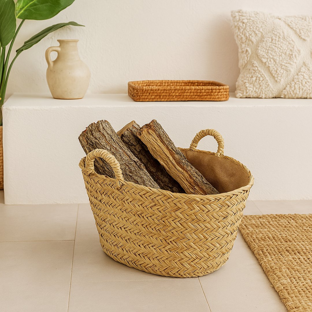 Embrace authenticity and artisanal charm with our Sicilia log holder, a handcrafted log holder with esparto grass handles . With its oval design, this log holder is not only a decorative piece but also a functional storage solution for your home .
