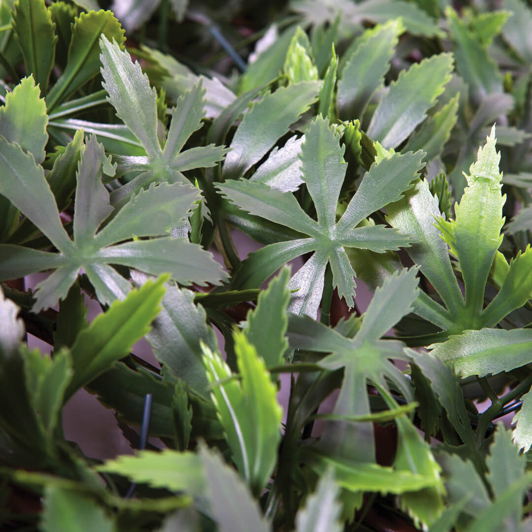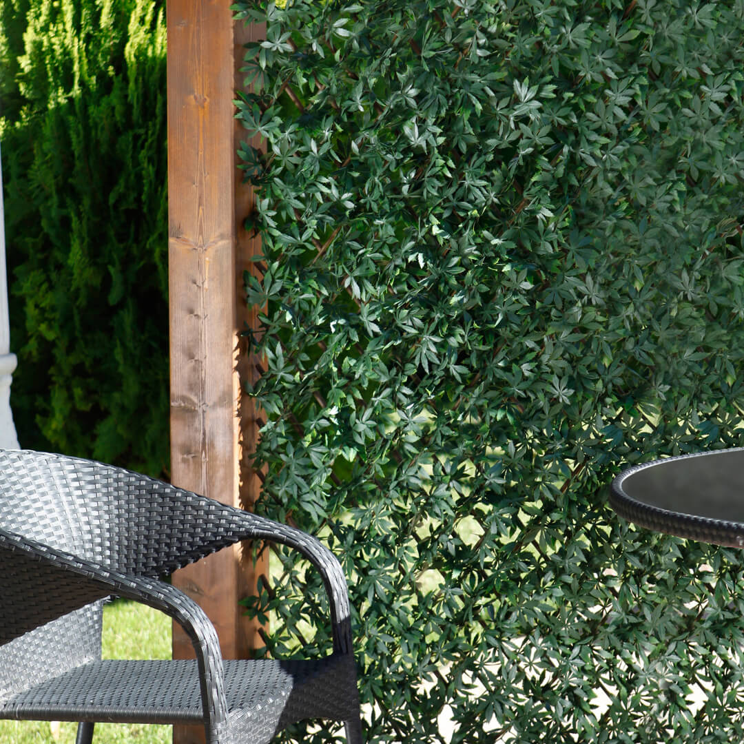 base du treillis est en osier, tandis que les feuilles d'érable vert sont en PVC, ce qui leur confère une meilleure résistance aux UV et à l'humidité. L'installation est très simple, car ce produit comprend tous les éléments nécessaires, tels que vis et attaches de câble, pour fixer les feuilles au treillis extensible.
