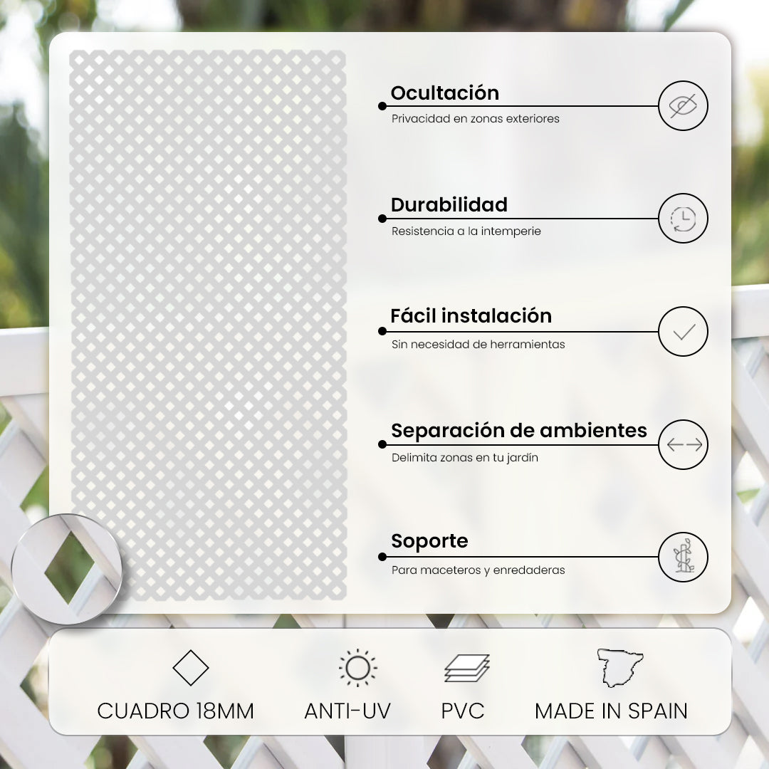 monter votre treillis en PVC. Le treillis fixe en PVC blanc de 18 mm est idéal pour décorer vos espaces extérieurs, patios, terrasses ou jardins. Si vous souhaitez créer une ambiance particulière chez vous ou dans votre jardin, ce treillis fixe est la solution parfaite. Il peut être installé verticalement ou horizontalement, selon les dimensions à couvrir et les besoins spécifiques de votre habitation. De plus, vous n'aurez aucun mal à obtenir les dimensions souhaitées, car elle se découpe facilement à la scie sauteuse.