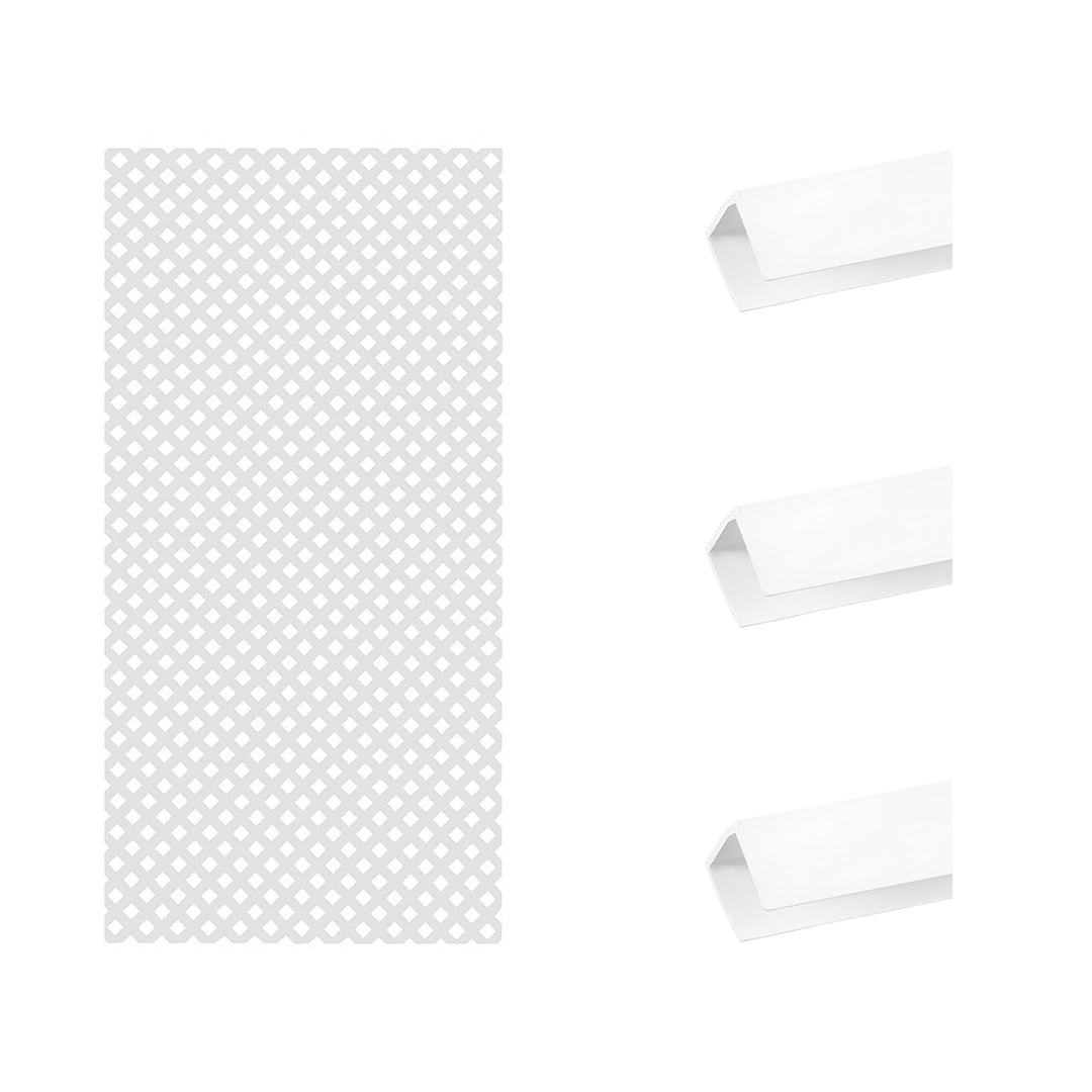 Este pack está compuesto por una celosía fija de PVC en color blanco y tres perfiles de remate, configurado para facilitar la instalación de un único panel en jardines, terrazas o patios. Los perfiles permiten reforzar la estructura y proporcionar un remate más limpio en los bordes de la celosía.