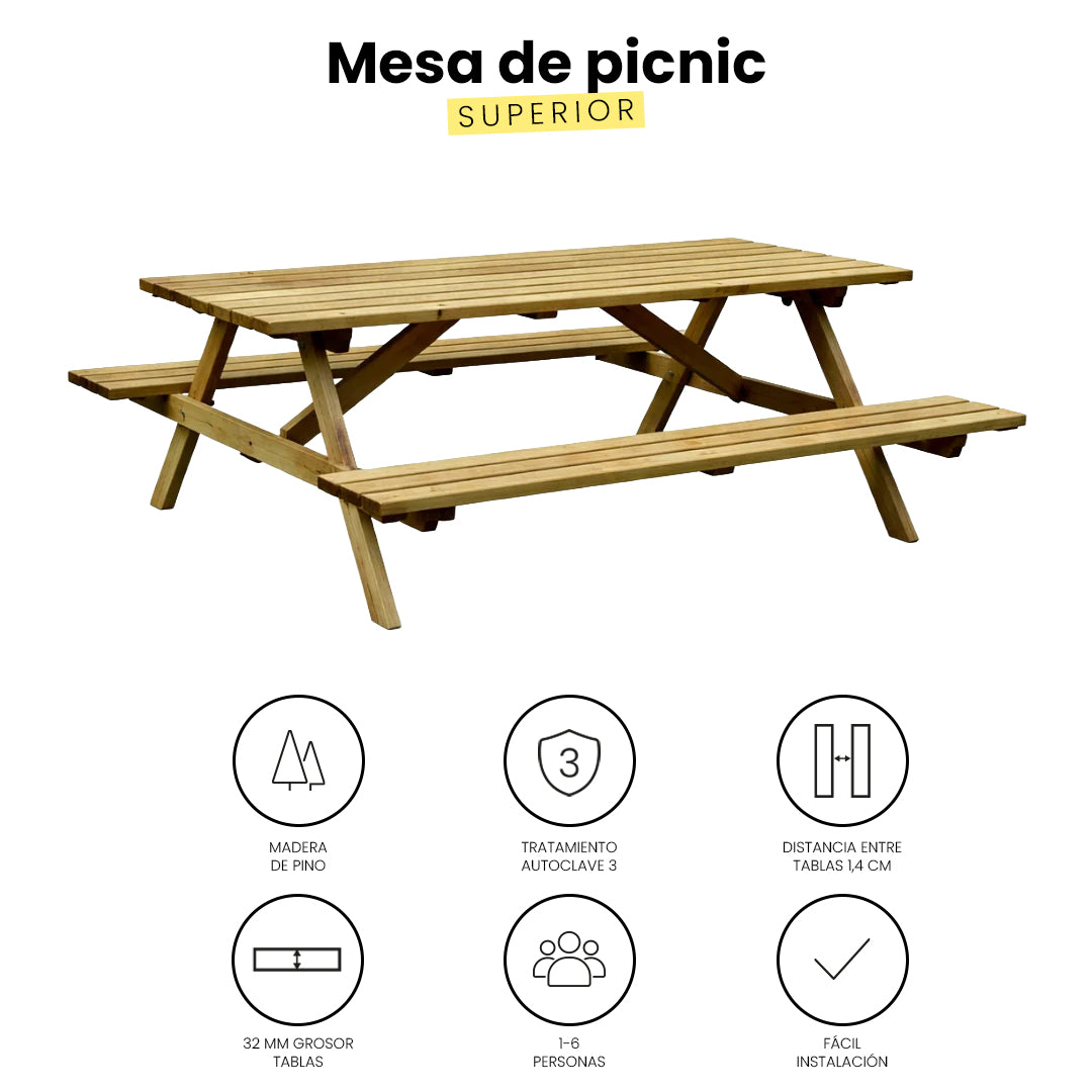 di panche con una capacità fino a sei persone. Un tipo di arredo da giardino perfetto per spazi esterni come patii, portici, piscine o aree ricreative, poiché il legno è trattato con  Autoclave 3, che gli conferisce un'ottima resistenza