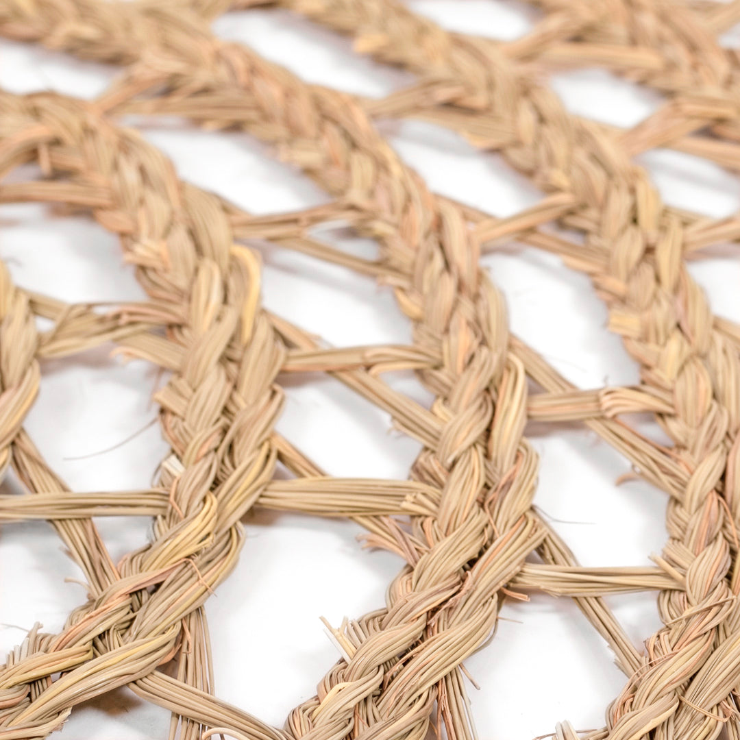 Tranzada a mano, esta alfombra de esparto hecha a mano se suma a la nueva tendencia en decoración con fibra natural que tanto despunta en decoraciones exteriores como las de porches o terrazas.