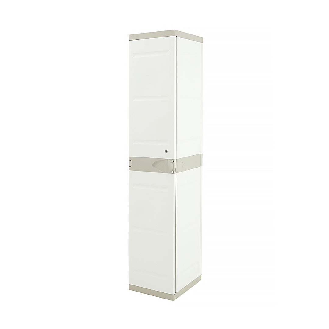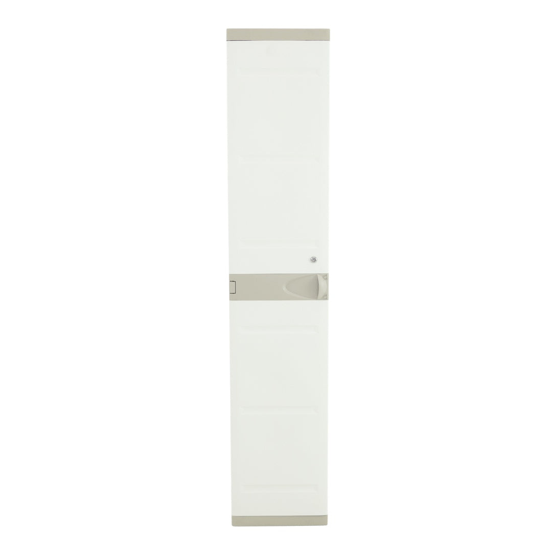 Armario beige de dos puertas con cuatro estantes regulables, perfecto para almacenar todo tipo de utensilios como herramientas, zapatos, cajas, etc.