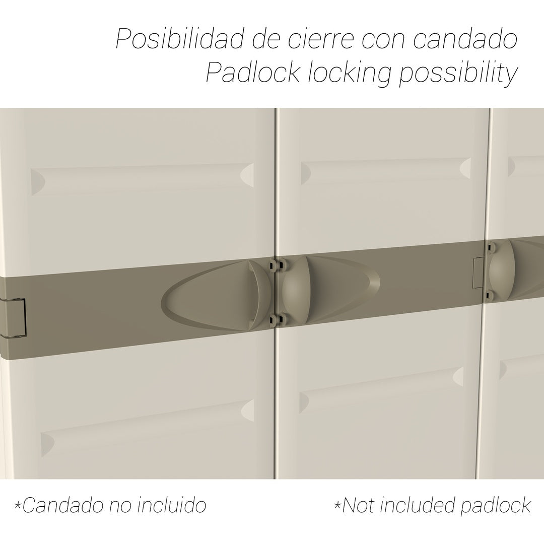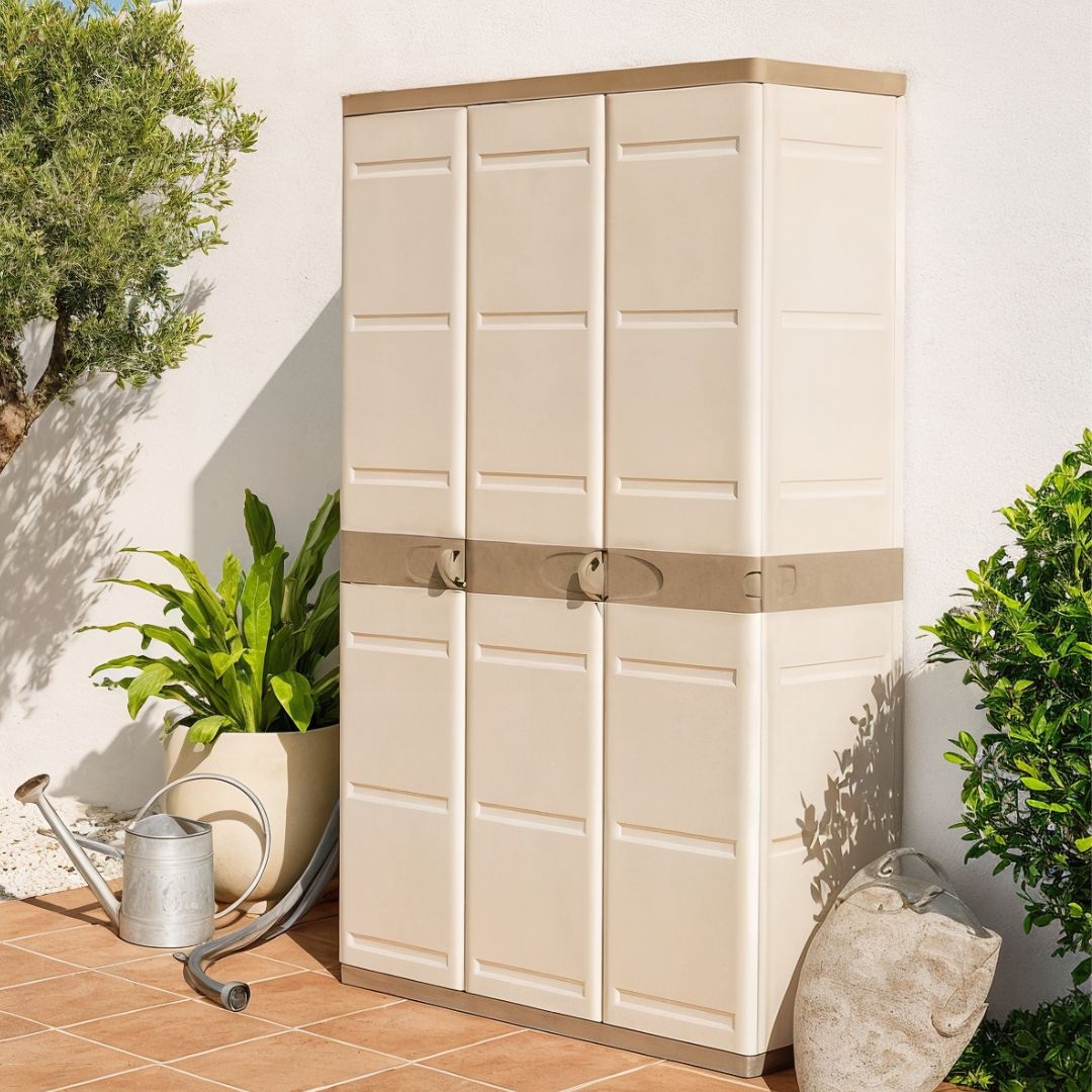 Fabricado con material de resina, este armario escobero es fácil de limpiar y resistente a la humedad y al sol, lo que lo hace apto tanto para interiores como para exteriores.