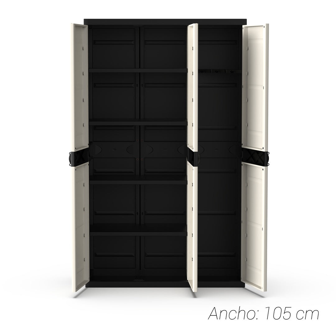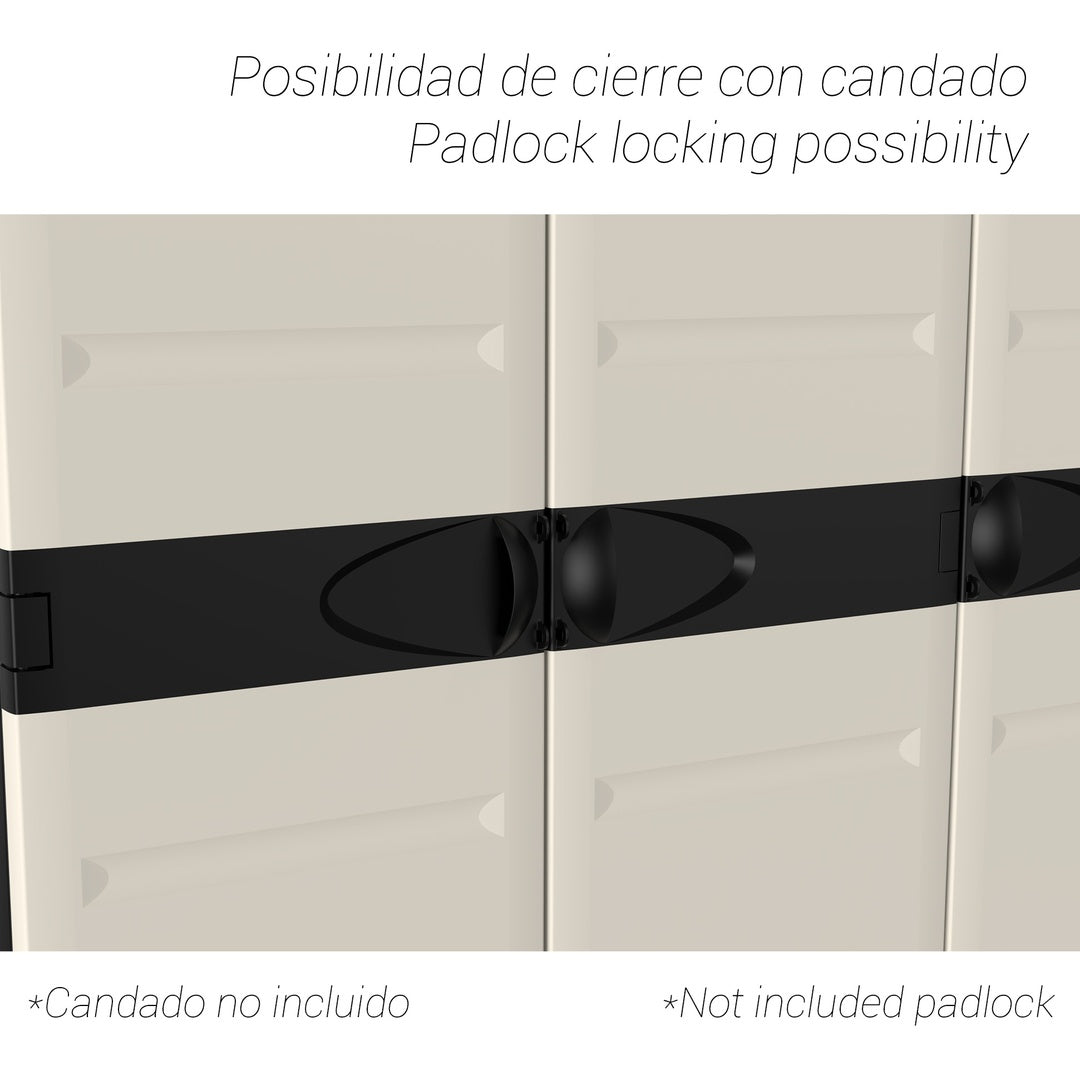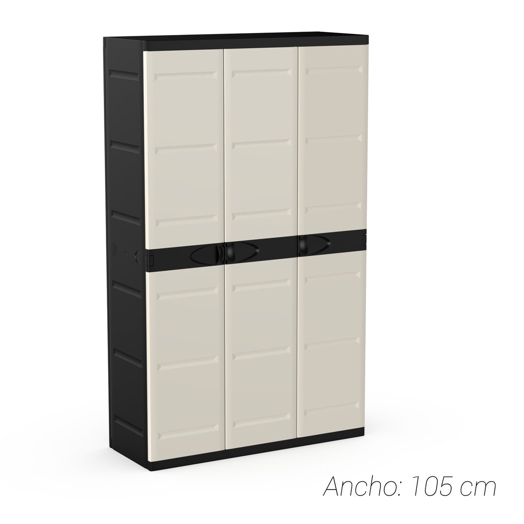 Si buscas una solución de almacenamiento que combine estilo y funcionalidad, el armario de resina de 3 puertas negro y beige es ideal para cualquier espacio, ya sea en interiores o exteriores. Su diseño modular y elegante se adapta perfectamente a garajes, terrazas o trasteros, permitiendo organizar tus herramientas, productos de limpieza o cualquier otro objeto de forma segura y eficiente.