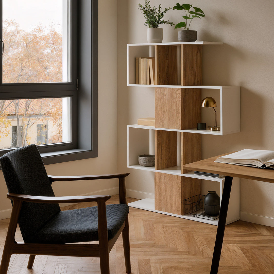 Fabricada con materiales de alta calidad, esta estantería combina la durabilidad con la belleza estética, El contraste entre el blanco y los acabados en roble agrega un toque de sofisticación a tu espacio, creando un ambiente acogedor y relajante.