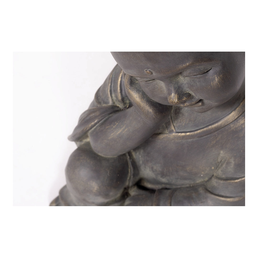 Fabricada con una mezcla de arcilla, fibra de vidrio y magnesia, esta figura combina ligereza y resistencia. Su acabado gris pizarra con pátina dorada aporta un contraste elegante y espiritual, ideal para decoraciones zen o feng shui.