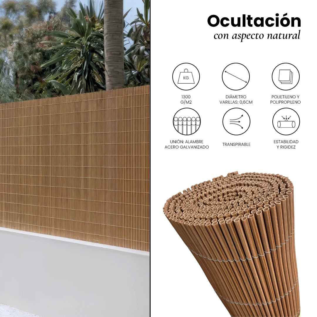 Fabricado con varillas huecas de polipropileno y polietileno, este cañizo destaca por su ligereza y resistencia, facilitando su instalación sin comprometer la estabilidad. Unido caña a caña con alambre de acero galvanizado, ofrece una gran rigidez y durabilidad. Su tratamiento anti-UV previene la decoloración y el desgaste, garantizando un aspecto impecable con el paso del tiempo.