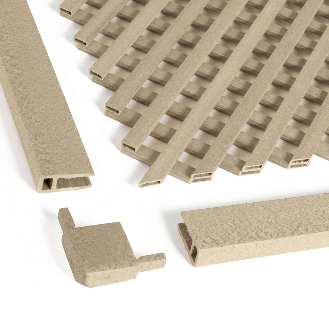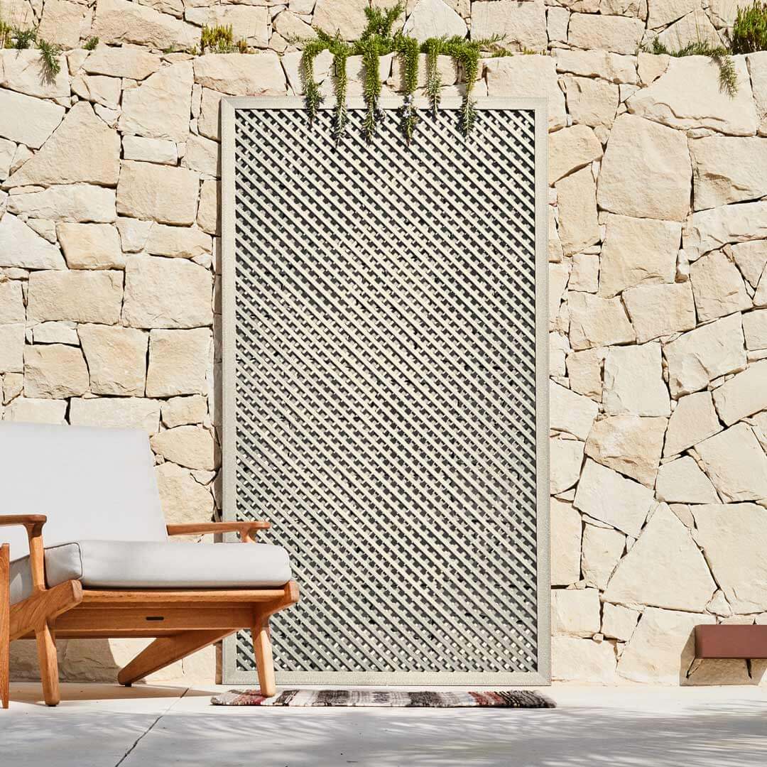 Este pack está compuesto por una celosía ecológica LOP en color Marfil, tres perfiles de remate y un kit de escuadras, configurado para facilitar la instalación de un único panel en jardines, terrazas o cerramientos exteriores.