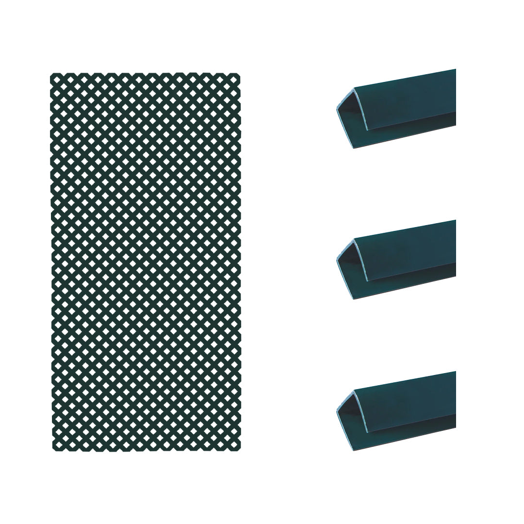 Este pack está compuesto por una celosía fija de PVC en color Verde y tres perfiles de remate, configurado para facilitar la instalación de un único panel en jardines, terrazas o patios. Los perfiles permiten reforzar la estructura y proporcionar un remate más limpio en los bordes de la celosía.