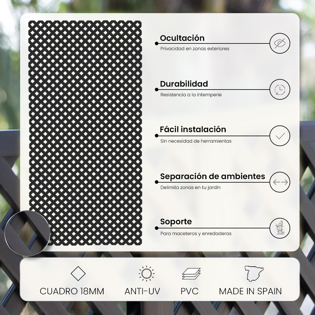 A treliça fixa em PVC de 18 mm na cor antracite é o produto ideal para decorar espaços exteriores como pátios, terraços ou jardins. Se pretende criar um ambiente especial na sua casa ou jardim, esta treliça fixa é a solução perfeita. Pode ser instalada na vertical ou na horizontal, dependendo das dimensões desejadas e das suas necessidades específicas. Além disso, não terá problemas em obter as medidas exatas de que necessita, pois pode ser facilmente cortada com uma serra tico-tico.